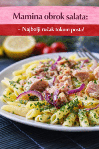 Sastojci: 1,300 g krompira; 200 g posnog majoneza (može i više ako volite kremastiju salatu); 100 g pečenog susama; 200 g tunjevine iz konzerve (bilo koje); veza peršunovog lišća; 2 čena belog luka (može i u prahu); 1 – 2 kašičice soli (tunjevina i majonez su već slani); 2 kašičice sirćeta.