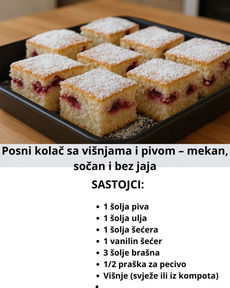 Ako tražite jednostavan posni kolač sa višnjama, koji je gotov za tren i ne zahtijeva mnogo sastojaka, ovo je pravi recept za vas! Ovaj kolač se priprema bez jaja, mlijeka i maslaca – savršen je za dane posta ili kada želite nešto lagano, a ukusno. Mekan, sočan i mirisan, podseća na starinski kolač lenja pita, ali verzija bez jaja i mliječnih proizvoda.
