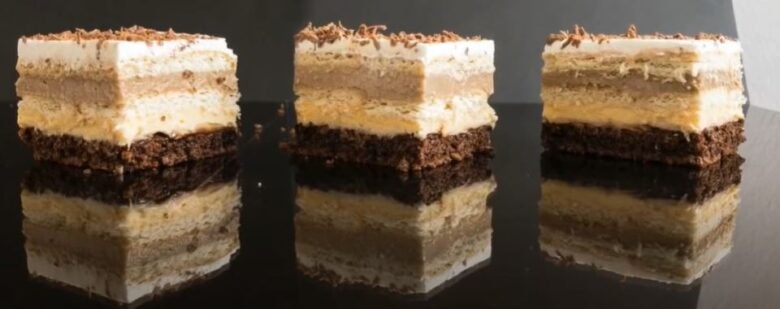 Kolač je najbolje ostaviti nekoliko sati u frižideru (ili preko noći) kako bi se svi slojevi lepo steglli i povezali. Seče se lako i izgleda vrlo dekorativno.