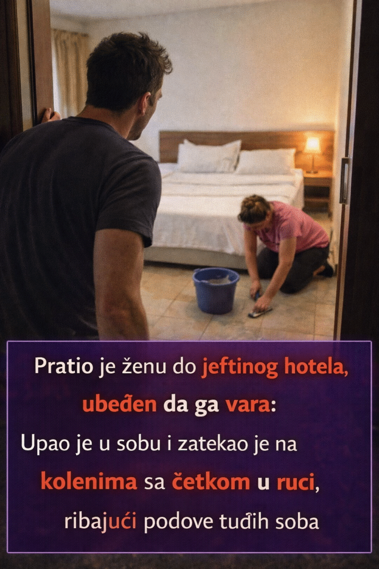 Marko je gledao u njene ruke – crvene, ispucale od hemikalija. U kantu s mutnom vodom. U kap znoja koja joj je kliznula niz obraz. „Mislio sam…“ jedva je izgovorio. Jelena je ustala, glas joj je zadrhtao. „Radim, Marko. Došla sam da čistim posle smene u kafiću. Trebaju nam pare. Nisam ti rekla jer sam znala da ćeš se slomiti. Htela sam da te sačuvam.“ Reči su iz nje potekle kao voda iz puknute cevi: dugovi, pretnje isključenjem, razgovori za posao posle čišćenja, haljina da bi izgledala pristojno pred poslodavcima.