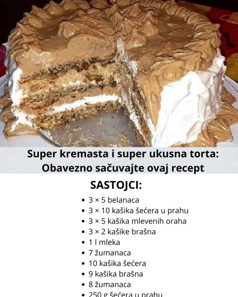 Napraviti 3 korice od po 5 bjelanaca, 10 kasika secera u prahu, 5 kasika oraha i 2 kasike brasna.Brasno i orahe pomijesati i lagano kasikom umjesati u izmucene bjelanjke.Pecite na 180 °C oko 25 minuta.Kad su kore pecene prekrite ih krpom dok spremate kremu.Na pec stavite 800 ml. mlijeka i 10 kasika secera da prokuhaju.Izmutite 7 zumanjaka, 9 kasika brasna i 200 ml. hladnog mlijeka pa istresite u prokuhalo mlijeko i skuhajte kao puding.
