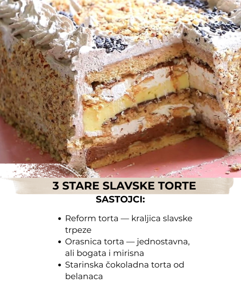 Predstavljamo tri neizostavne starinske torte koje su krasile slavske trpeze naših baka: reform tortu, orasnicu i čokoladnu tortu sa korama od belanaca.
